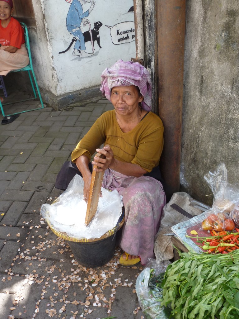 How else could I have found words to describe the doors of warehouses yawning open over the sewage filled canals in the port of Surabaya. Or pillars of sky-blue barrels and bamboo baskets waiting to be filled with fish for the market. Or the intelligent eyes of a woman crouched in a narrow street shaving coconut into a basket and surrounded by stalks of pungent lemongrass and brightly colored peppers. I don’t feel like a fraud anymore, my words given a little authenticity because I was there too.
